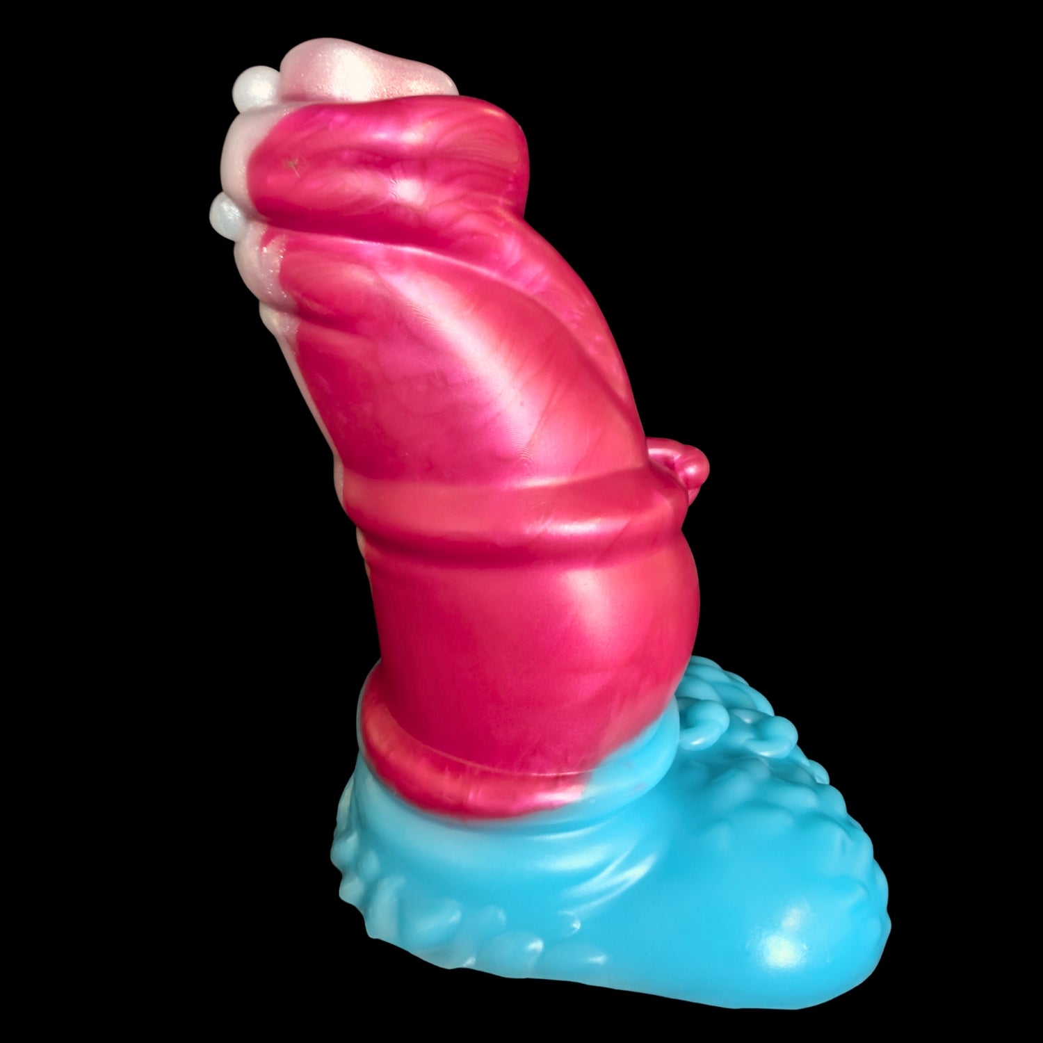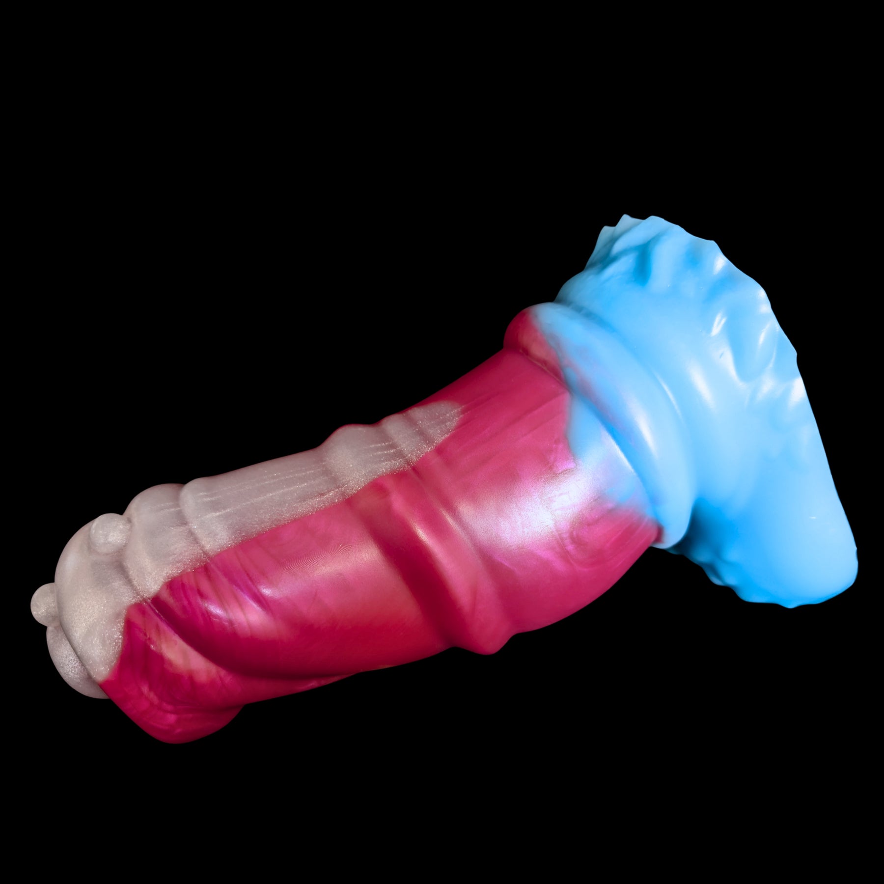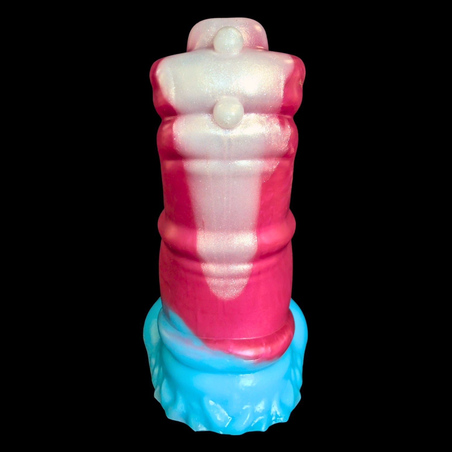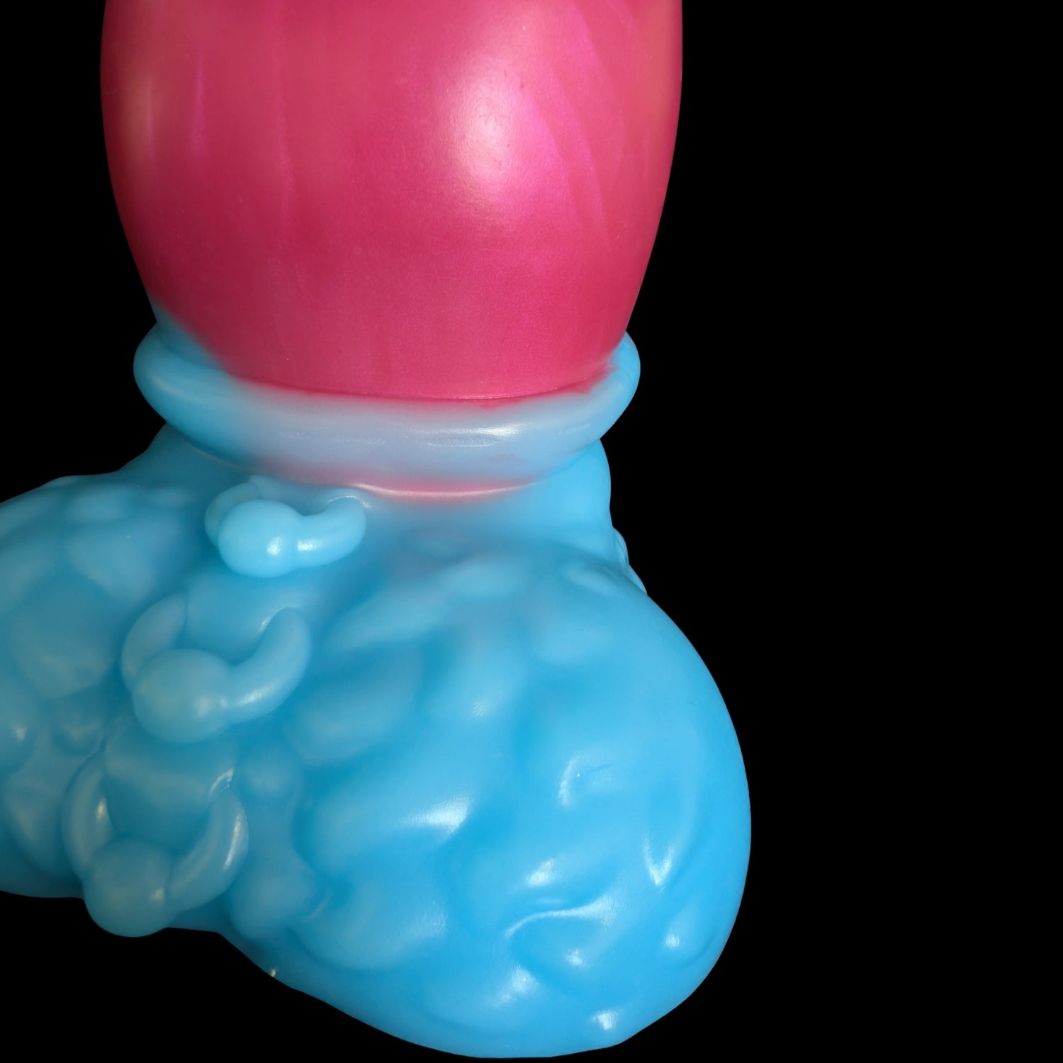 This is a premade toy, you will receive the exact toy pictured. It is a XXL Sylenos, Satyr God, Split style in Blue Glow-in-the-Dark and Valentine with Sparkle White Cum drips, in Classic firmness. This toy is a FLOP. There is significant color bleed between the base and upper colors as shown in the pictures.